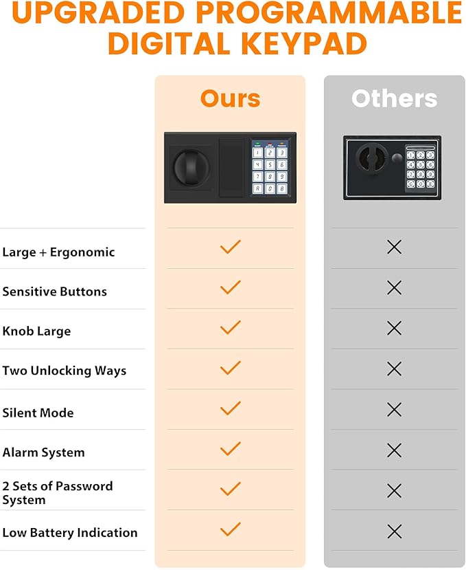 The large digital safe features an easy-to-use numeric keypad and spare keys for emergency access. The raised, angled keypad design is more ergonomic than flat keypads and improves ease of use. You can program your own personal access code for quick entry or use the backup key when needed. Each safe has a uniquely coded keyhole—if you forget your password or lose the keys, you can contact us to request a replacement key.