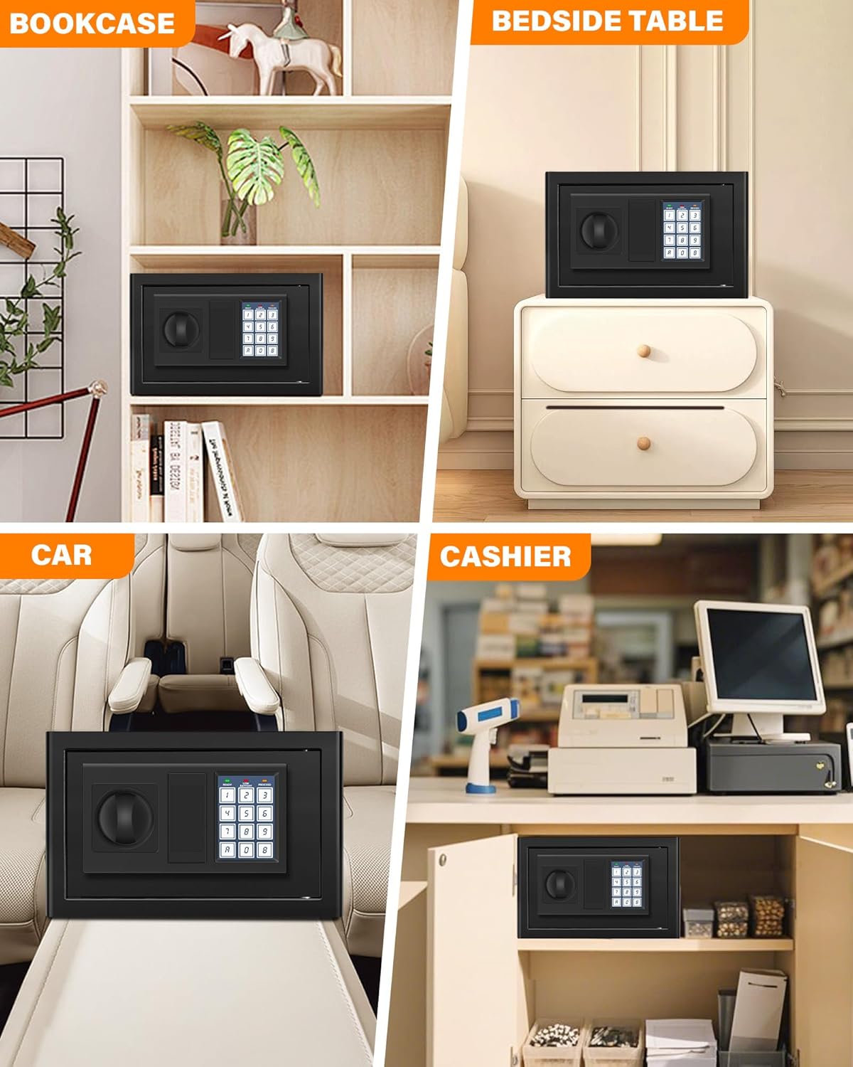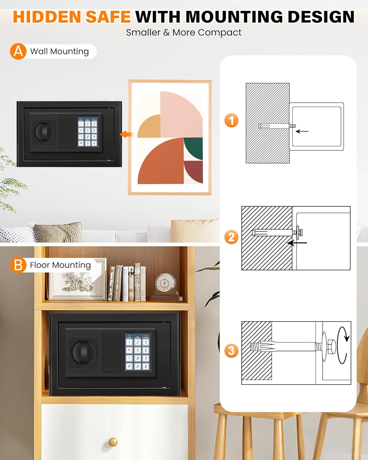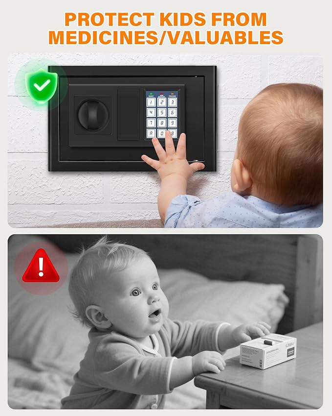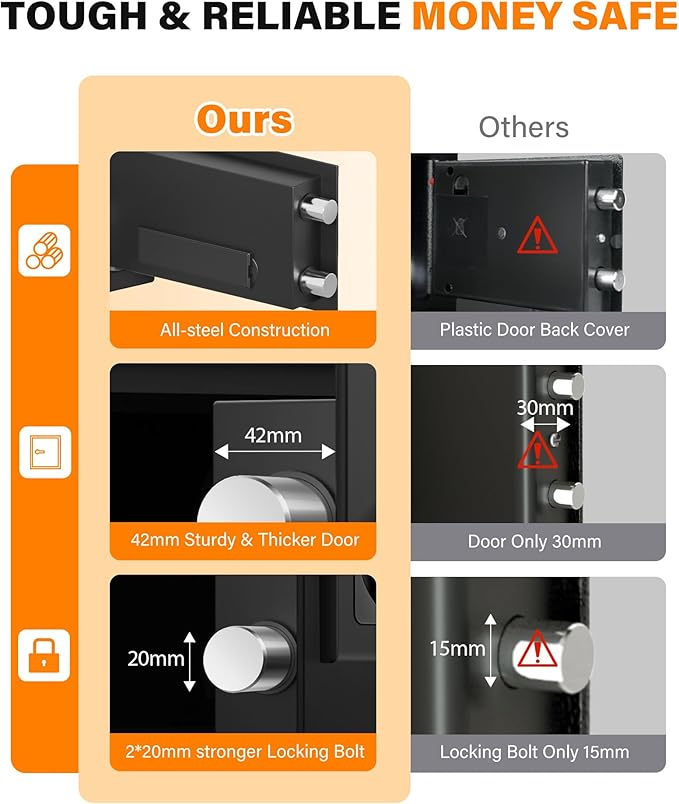 This home security safe is constructed from solid cold-rolled steel with integral welding and a recessed, pry-resistant door. Equipped with two reinforced steel locking bolts, it offers reliable protection for your valuables. The scratch- and stain-resistant powder coating helps prevent rust and long-term damage.