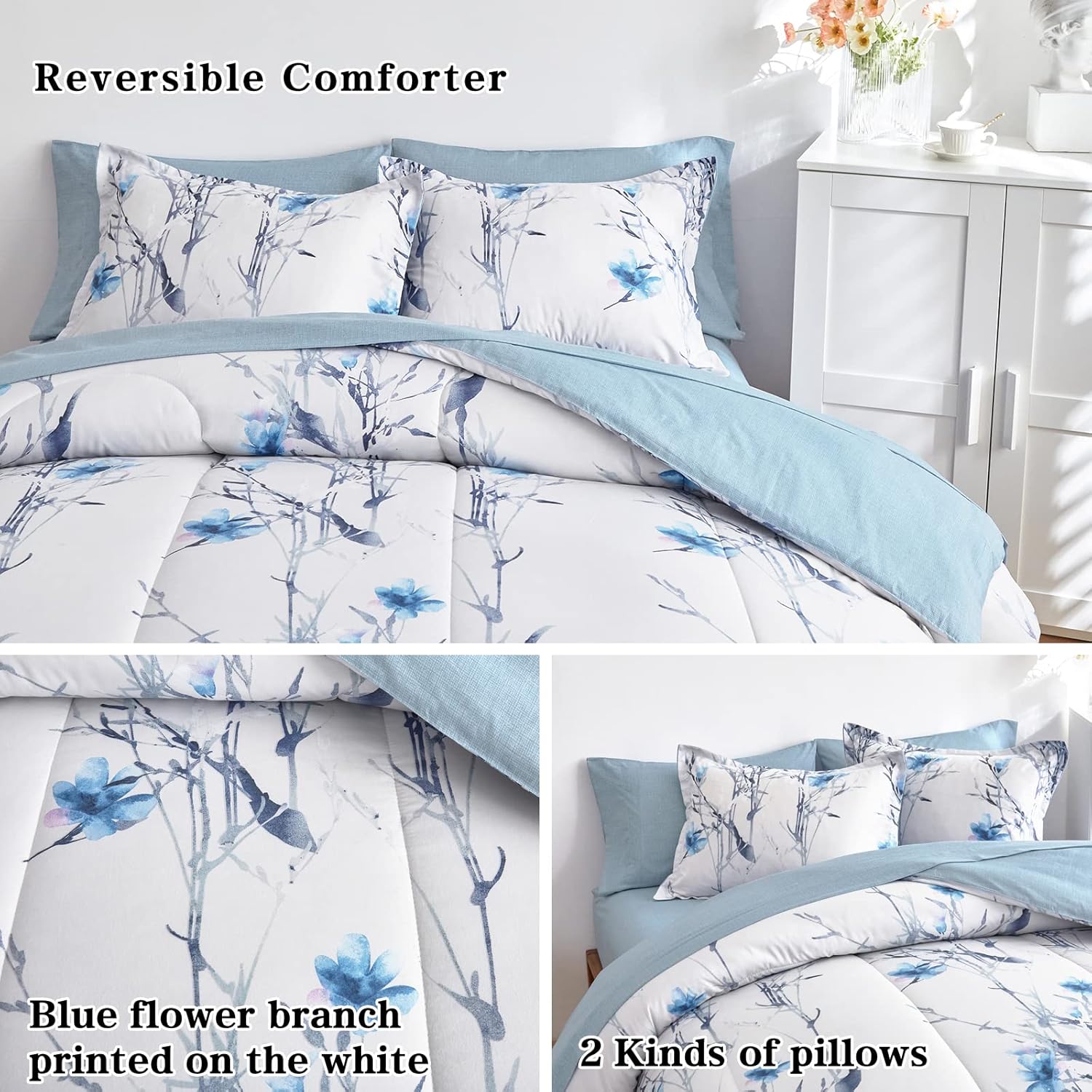 7 Pieces Bed in a Bag King Comforter Set with Sheets, Blue Flower Branch on White Botanical Bedding Sets for All Season (1 Comforter, 2 Pillow Shams, 1 Flat Sheet, 1 Fitted Sheet, 2 Pillowcases)