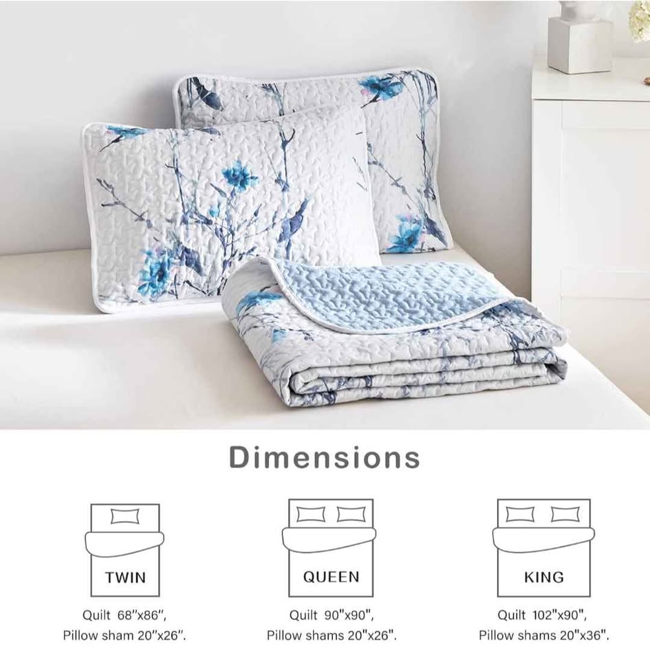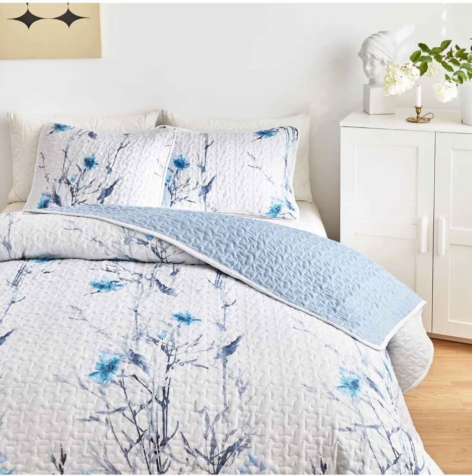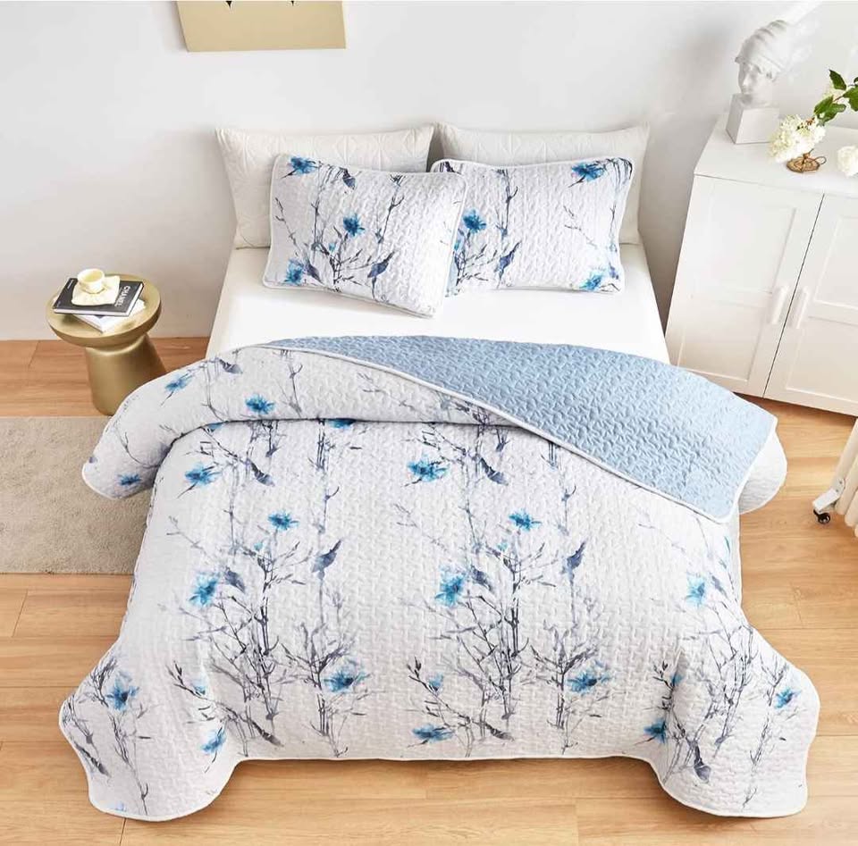 Is Botanical Quilt Set ke saath apne bedroom ko dein ek fresh aur elegant look. White background par blue flower aur branch print room décor ko stylish aur soothing banata hai. Reversible design ki wajah se yeh bedspread har season ke liye perfect choice hai.