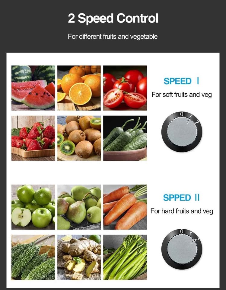 - Speed 2 (High): Perfect for hard fruits & vegetables (carrot, apple, pear)