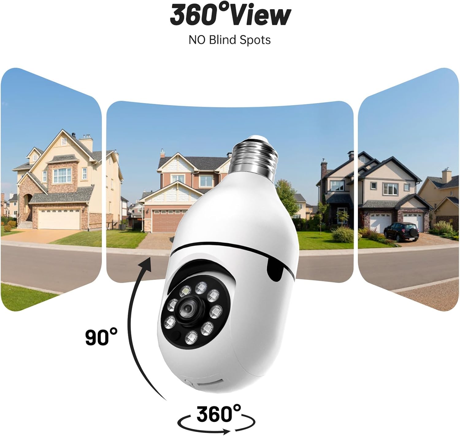 - 【5GHz & 2.4GHz Dual Band Connectivity】The light bulb camera outdoor/ indoor works both with the 2.4GHz and 5GHz WiFi, which provide high stability, strong signal reception, long distance to use, clear and detailed video footage. The light socket security camera that has 360° field of view, offer a full indoor protection.