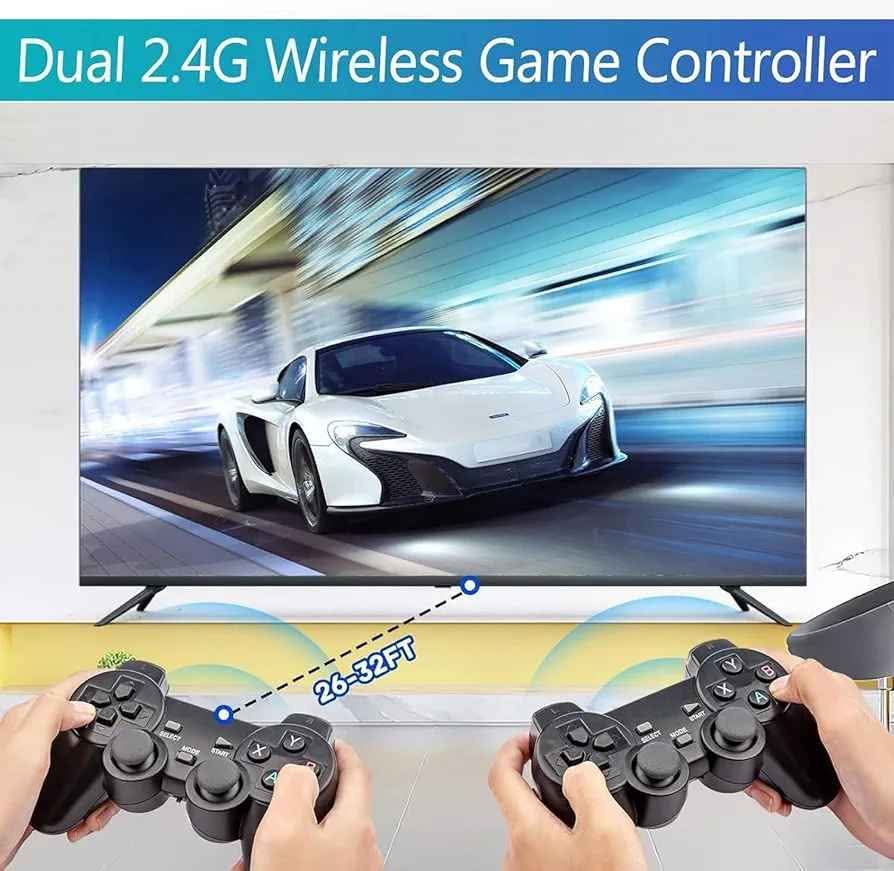 The Game Console system comes with over 20,000 built-in retro games and pre-installed emulators, so you can play all your favorite classic games without the need for downloads or an internet connection. Relive the joy of classic games with family and friends. 【2 Wireless Controllers】The 2.4GHz wireless controller supports 2 players. With the help of the wireless game controller, you can play your favorite classic games on the comfortable sofa without being hindered by any cables. Easy to Use】Setup Instructions: 1. Insert the controller receiver into the game console, then connect the console to your TV’s HDMI port. 2. Plug the USB cable into the TV’s USB port (or use an external power adapter if needed) to power the device. Ensure the console’s indicator light turns blue, then switch your TV to the correct HDMI input. The gaming interface will launch automatically.